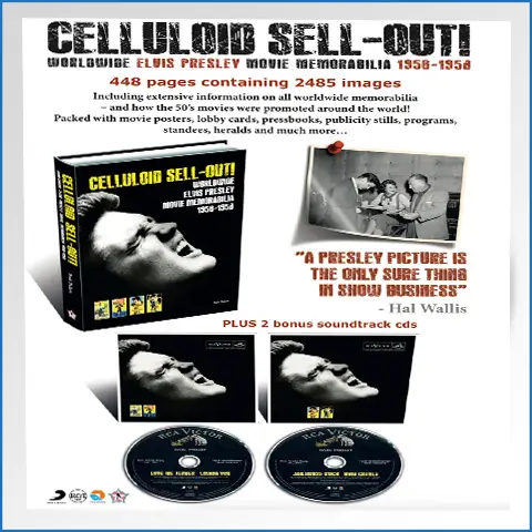FTD Books presents ”Celluloid Sell-Out! 448 pages of Worldwide Elvis Presley movie memorabilia from 1956-1958. It’s packed with movie posters, lobby cards, pressbooks, publicity stills, programs, standees, heralds and much more! Plus 2 bonus CD's featuring the soundtracks from Love Me Tender, Loving You, Jailhouse Rock and King Creole.