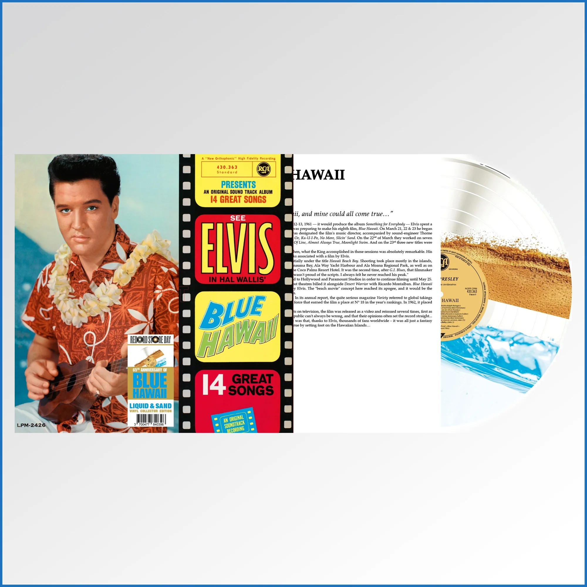 Tauche ein in die zeitlose Magie Hawaiis mit dieser exklusiven "Liquid"-Vinylversion des legendären Soundtrack-Albums "Blue Hawaii", präsentiert von Culture Factory zum Record Store Day 2026! Erlebe Elvis Presleys unvergessliche Melodien und die ikonische Atmosphäre des Films wie nie zuvor. Diese streng limitierte Auflage ist ein wahres Kunstwerk: Die "Blue/Sand Liquid-Filled Vinyl" bietet nicht nur eine atemberaubende Optik, bei der die Farben wie Ozeanwellen in einem Sandstrand tanzen, sondern auch ein unvergleichliches haptisches Erlebnis. Jede Bewegung des Albums wird zu einem visuellen Spektakel – ein flüssiger Tanz, der die tropische Kulisse des Films perfekt einfängt.