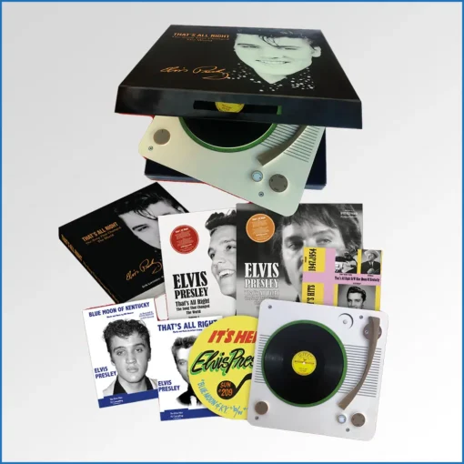 Presenting a unique collector’s item like you have never seen before! Housed in a box with a magnetic closure which features a NEVER-BEFORE-SEEN 1954 Blue Light Studio picture on top. When you open the box, you’ll look at a mock-up 3D record player with the first 78 printed on top, a 7" 45 rpm EP (4 songs – That’s All Right & Blue Moon Of Kentucky recorded by all three artists – Elvis, Arthur Crudup and Bill Monroe), two 12" albums (12 songs on each).